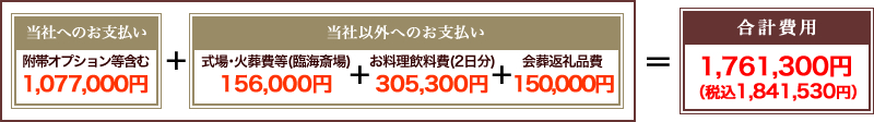 通夜 お寿司・煮物・オードブル 252,800円 葬儀 会席膳@3500×15名分(親族分) 52,500円 臨海斎場の場合 持ち込み可 |